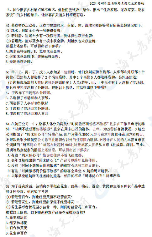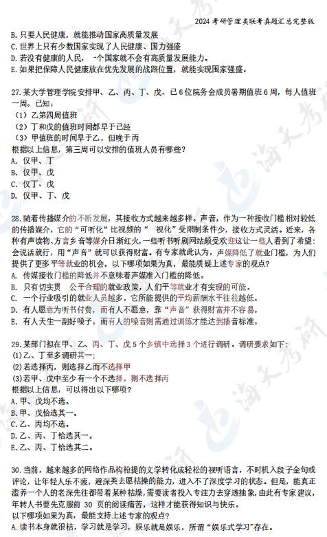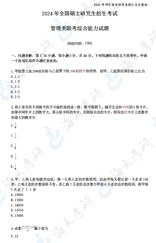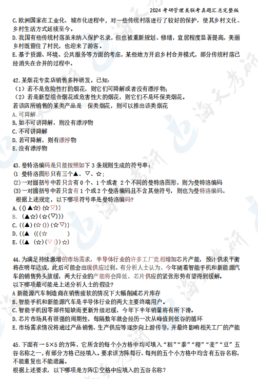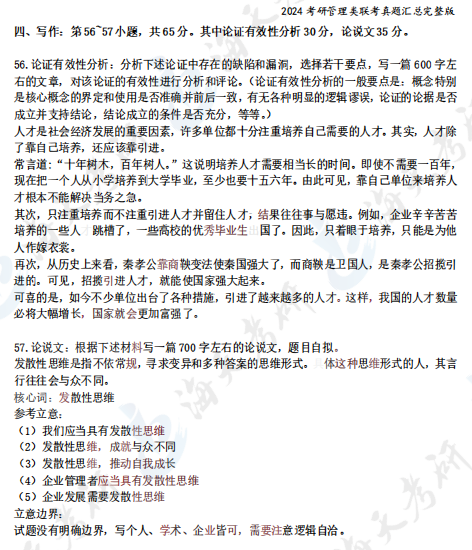 以上就是海天考研网为各位考生整理的2024考研管理类综合能力真题汇总完整版,持续为考研学子更新考研政治、数学、英语、396考研真题及答案解析等,各位考生可以根据自身需要关注收藏,及时查看完整版2024考研真题及答案解析。